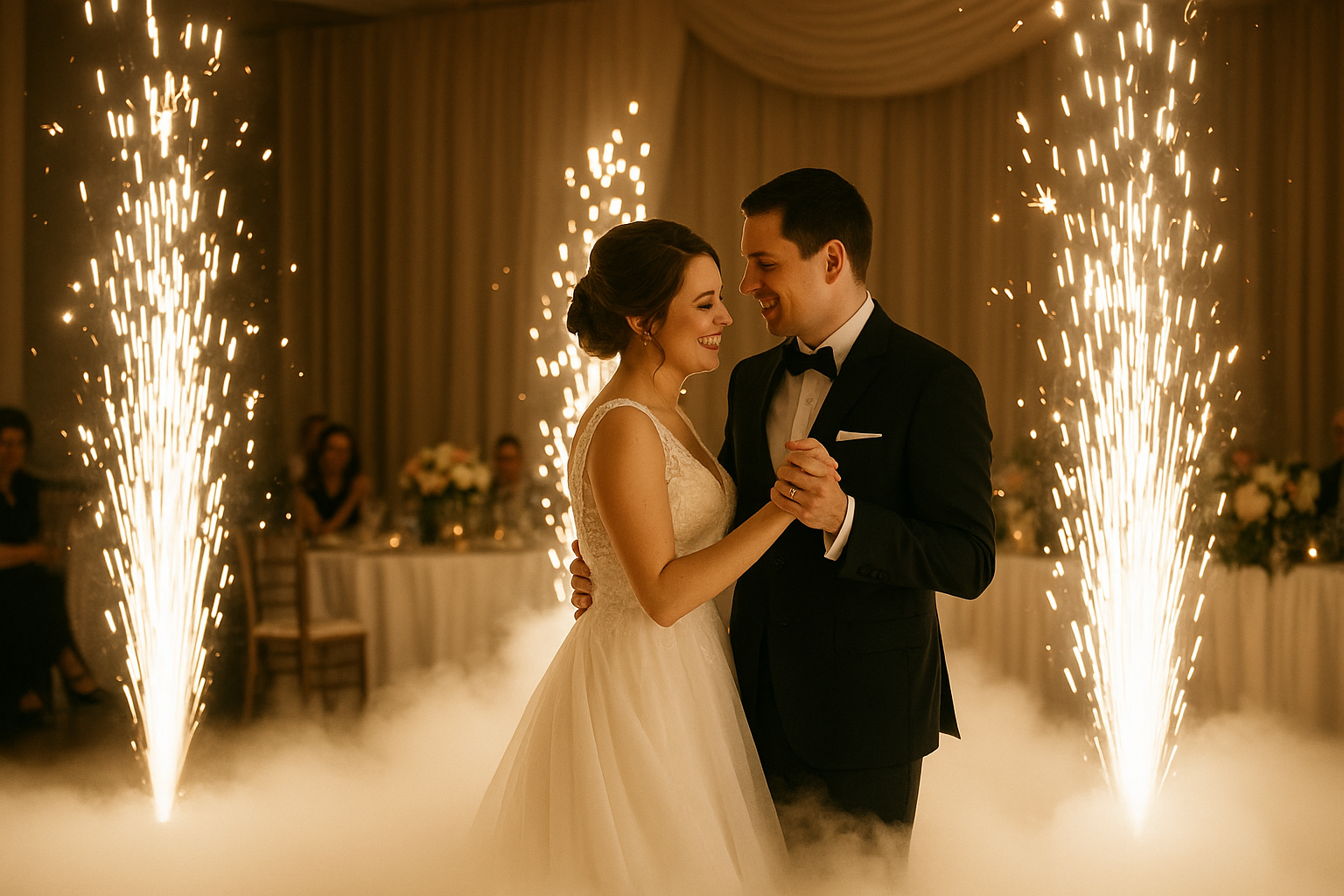 Oferim 4 vulcani pirotehnici de interior cu o inaltime aproximativa de 2 metrii si declansare wireless cu asezare in functie de organizarea salii si dorinta dumneavoastra si a fotografului adaugand de asemenea o masina de fum greu alimentata cu gheata carbonica.